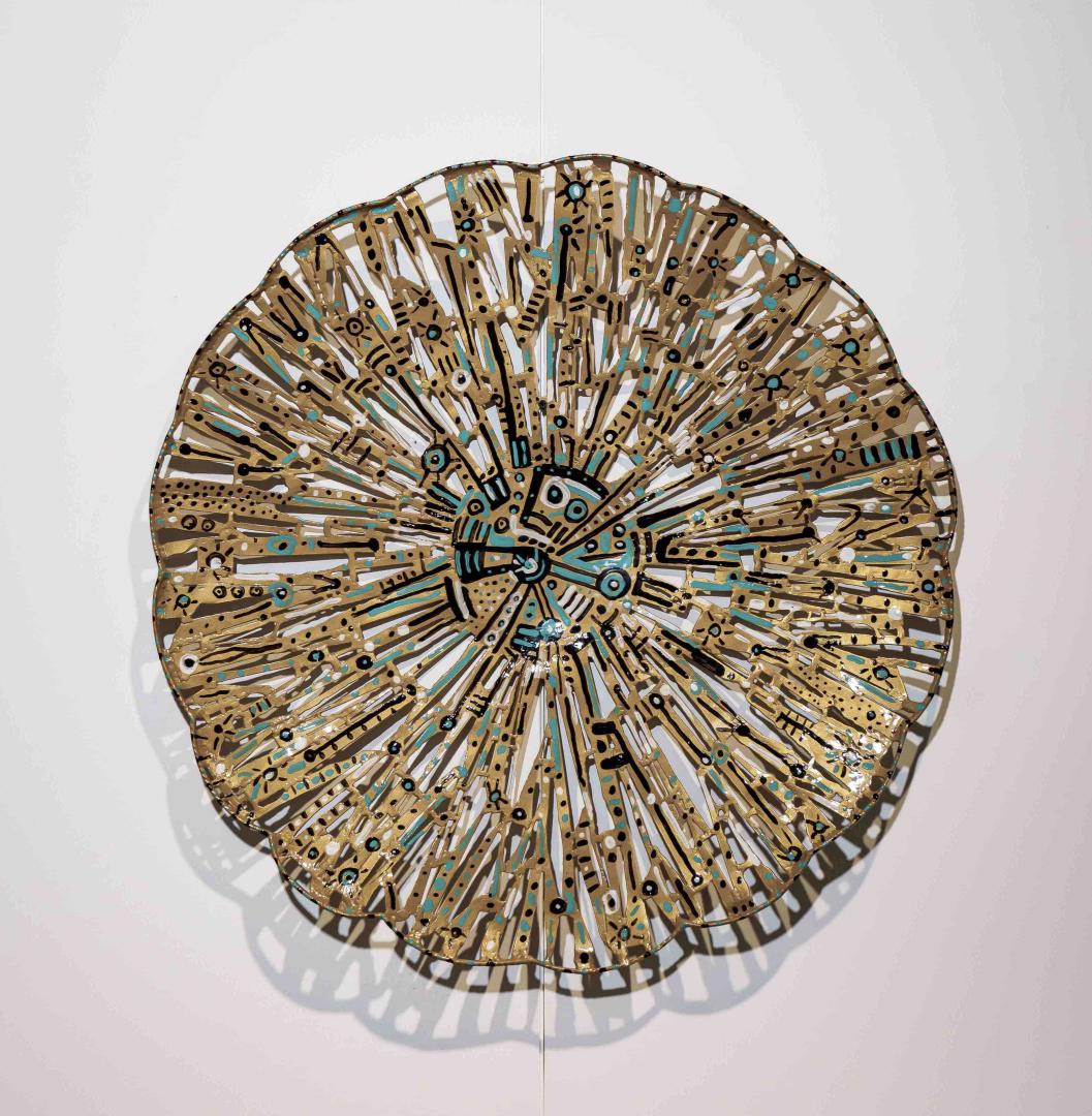 "Cette série se trouve à mi-chemin entre l’objet du quotidien et l’œuvre d’art. Le rythme trépidant des couleurs fait vibrer la pièce et exploser sa forme.