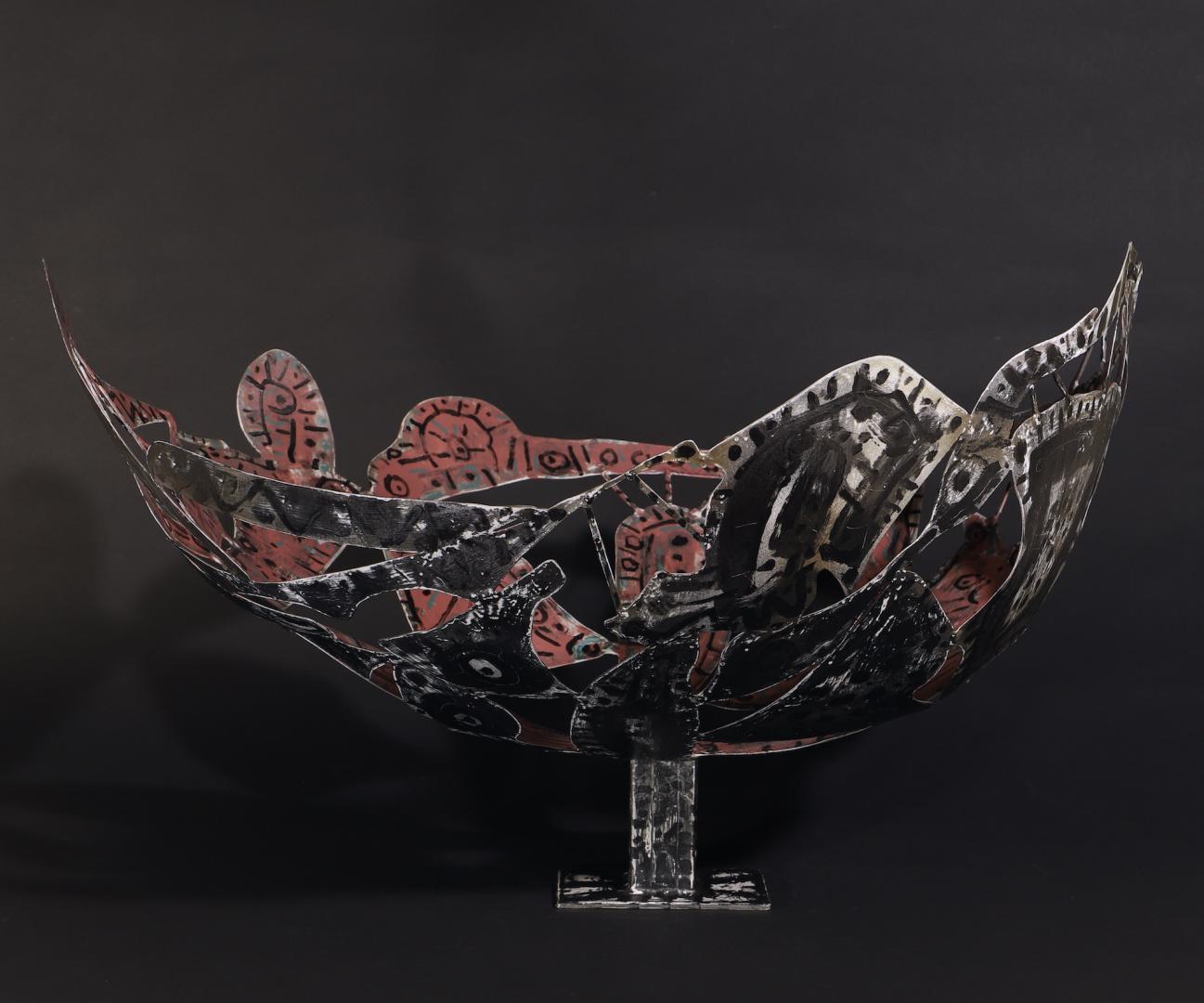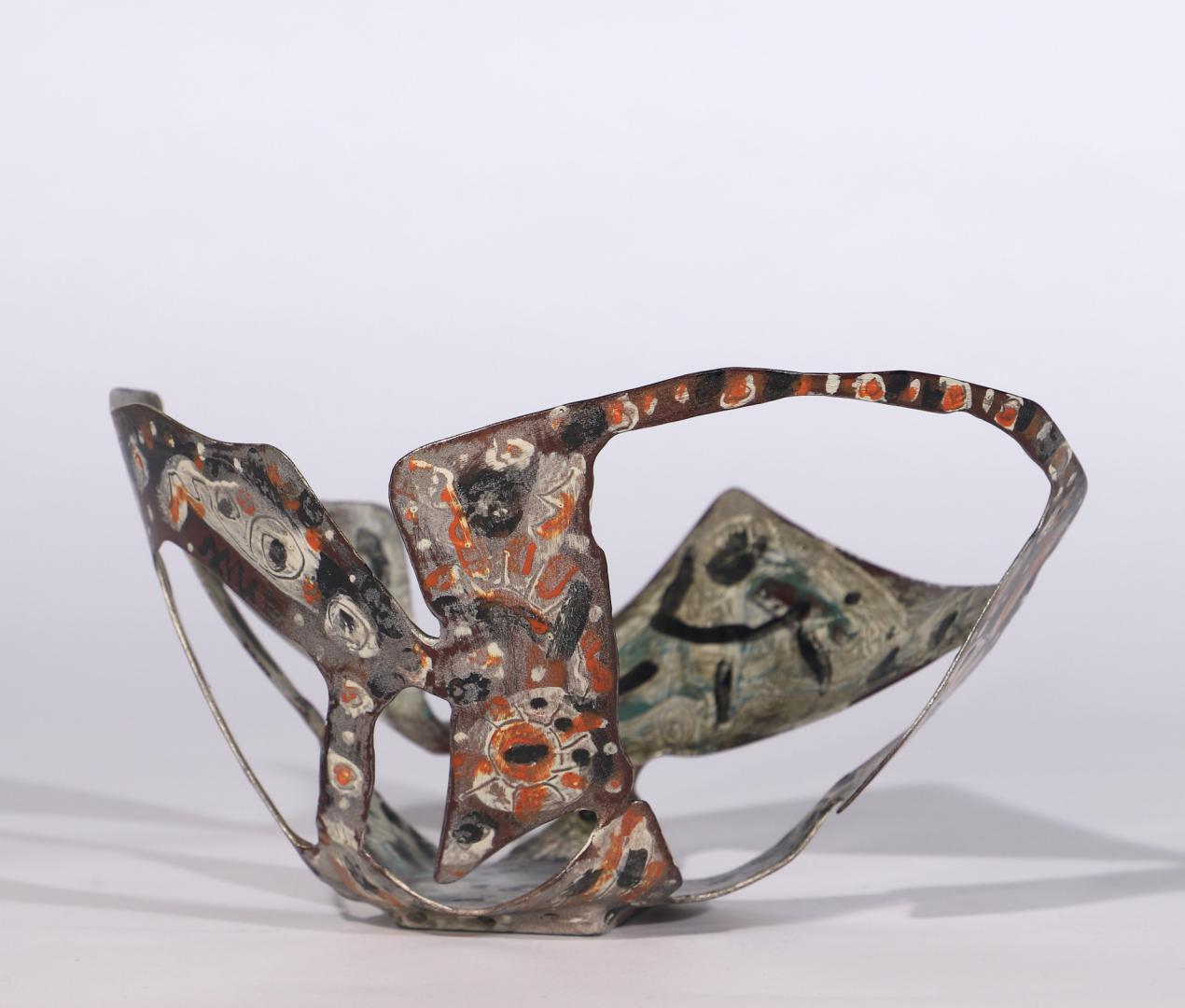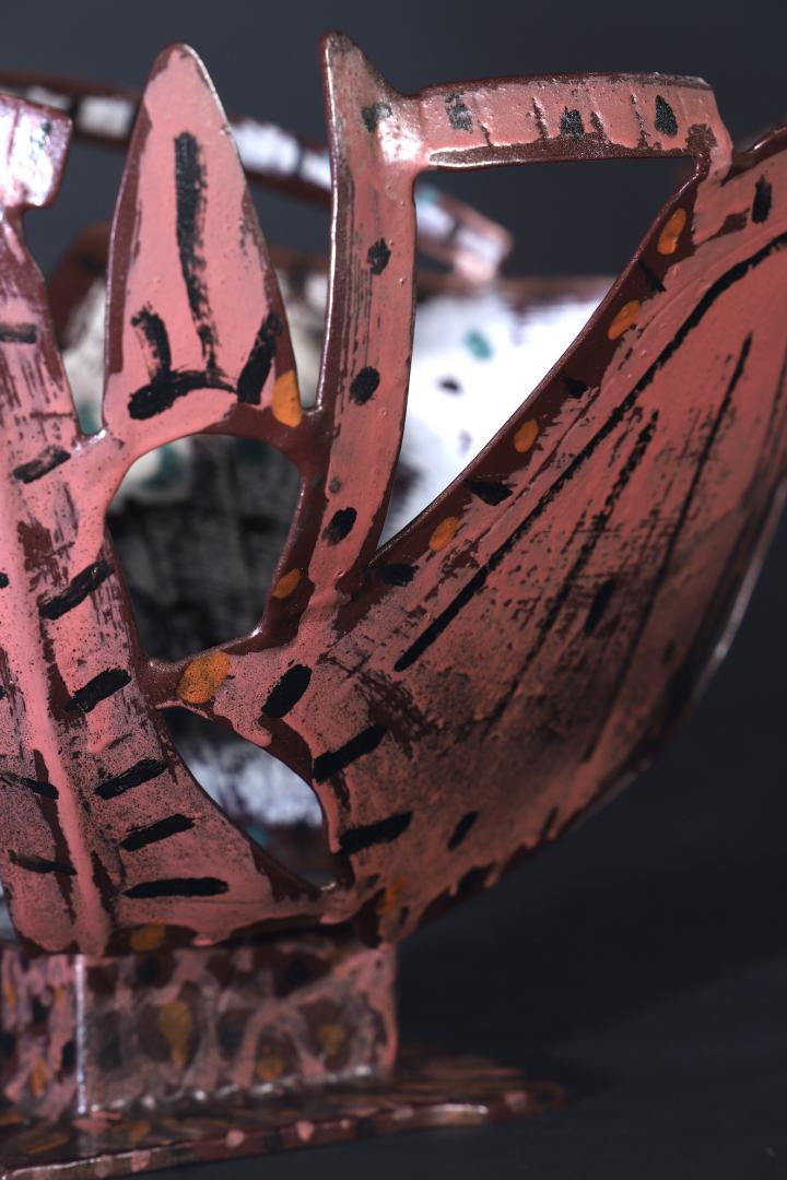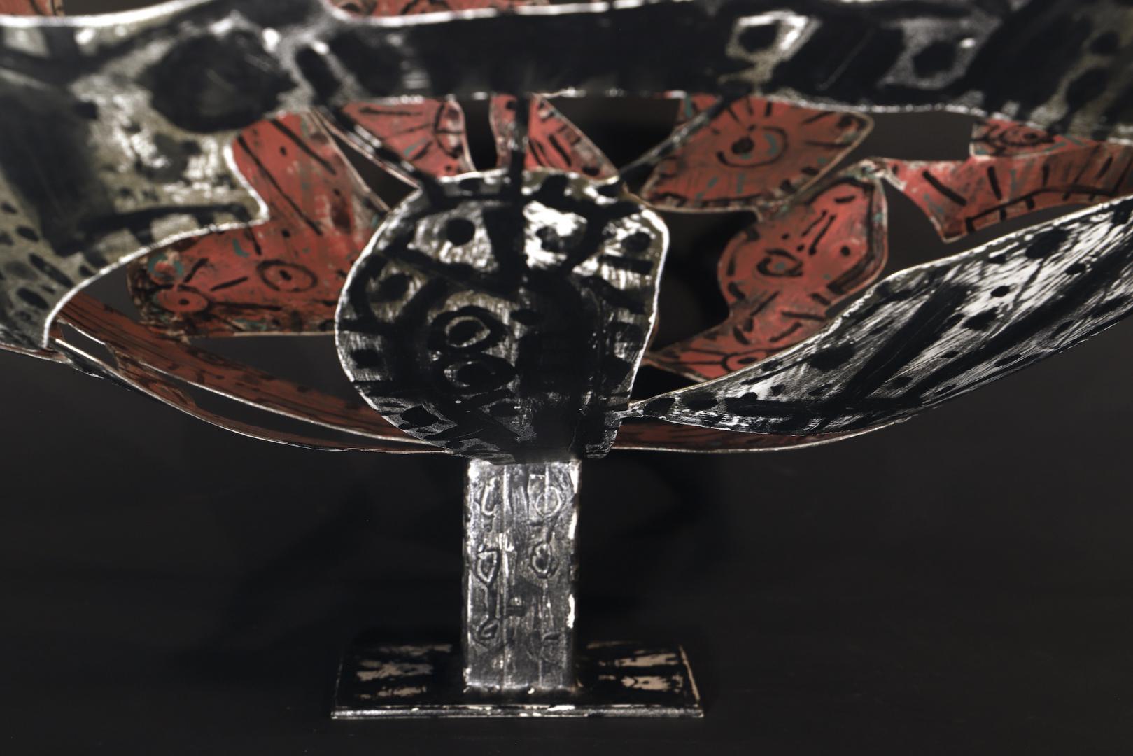 Mais avant d’être un plateau ou un vase, ces pièces sont d’abord et surtout des sculptures et leur réalisation a été guidée par mes exigences de sculpteur, à savoir une œuvre rythmée, qui se définit et qui à sa propre fonction dans l’espace. La peinture est venue jouer un rôle primordial en exaltant les formes de ces sculptures, les faisant vibrer d’avantage, leur donnant un aspect graphique et libre. Et comme je l’explique souvent à propos de mes sculptures peintes, j'essaie à travers une peinture quasi tribale "d'exploser" ces creux et ces pleins dans un tourbillon agité mais bien proportionné et guidé par un certain rythme voulu et essentiel à mon œuvre."