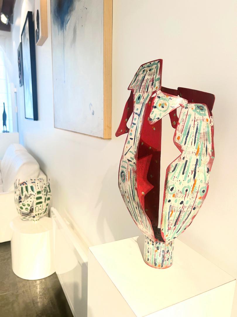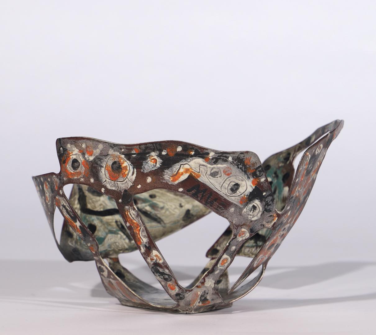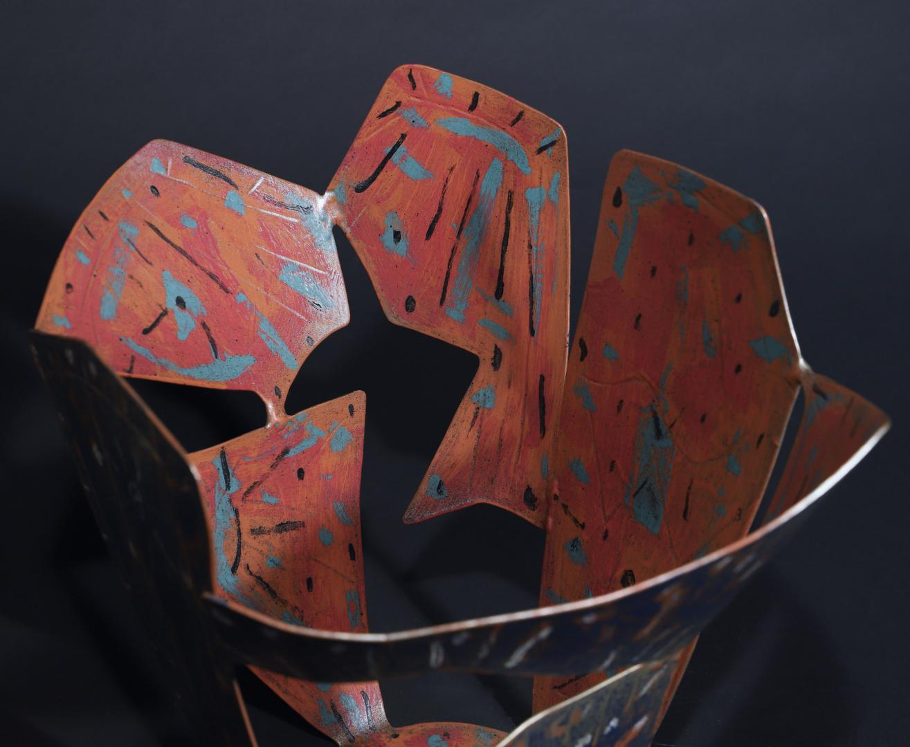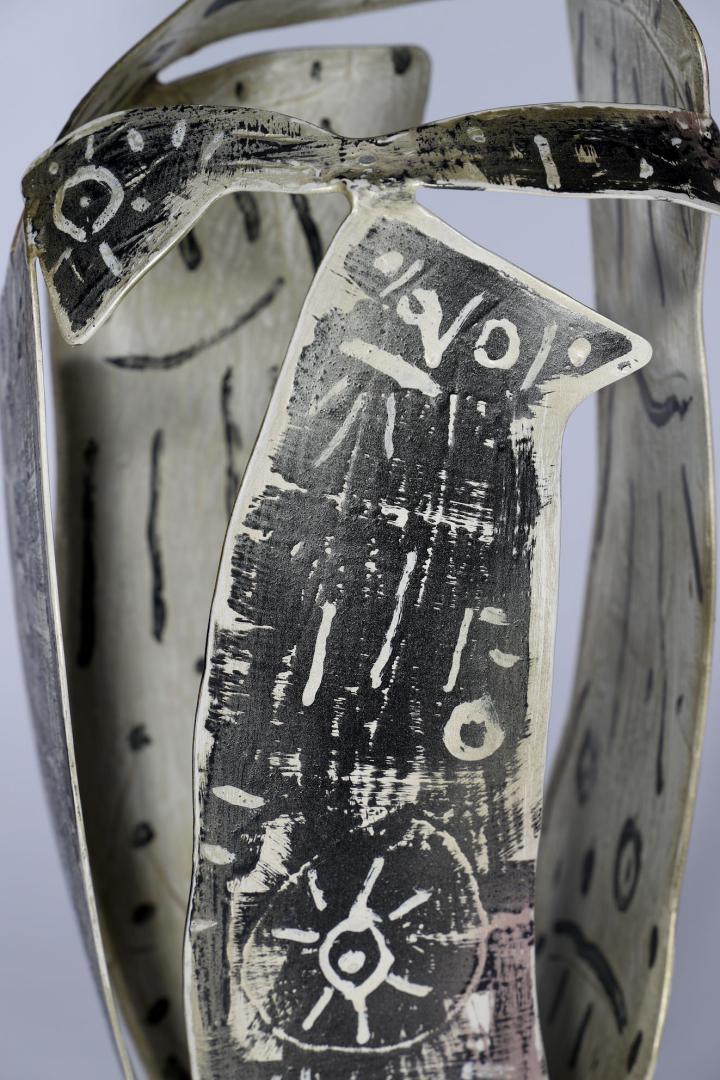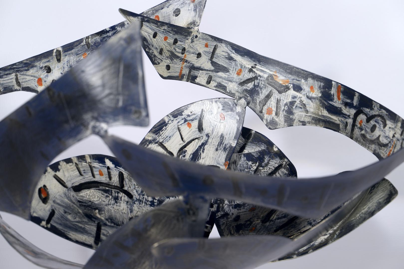 Mais avant d’être un plateau ou un vase, ces pièces sont d’abord et surtout des sculptures et leur réalisation a été guidée par mes exigences de sculpteur, à savoir une œuvre rythmée, qui se définit et qui à sa propre fonction dans l’espace. La peinture est venue jouer un rôle primordial en exaltant les formes de ces sculptures, les faisant vibrer d’avantage, leur donnant un aspect graphique et libre. Et comme je l’explique souvent à propos de mes sculptures peintes, j'essaie à travers une peinture quasi tribale "d'exploser" ces creux et ces pleins dans un tourbillon agité mais bien proportionné et guidé par un certain rythme voulu et essentiel à mon œuvre."