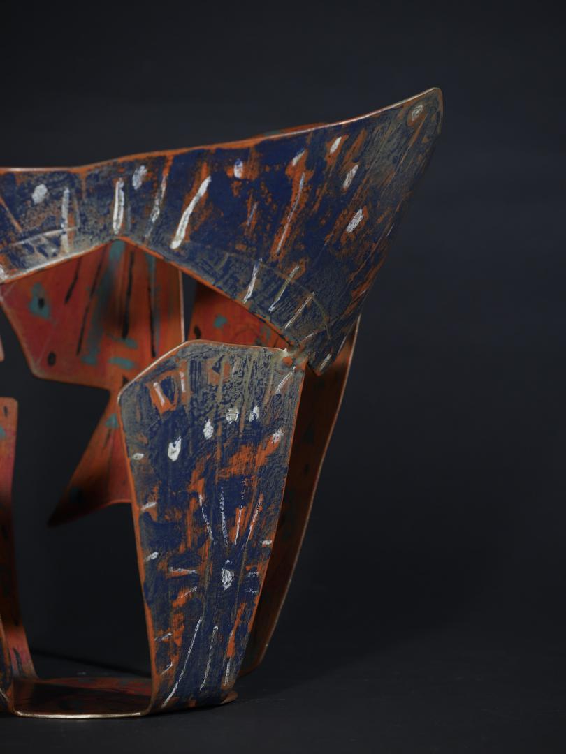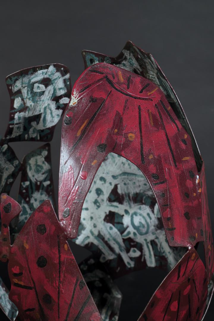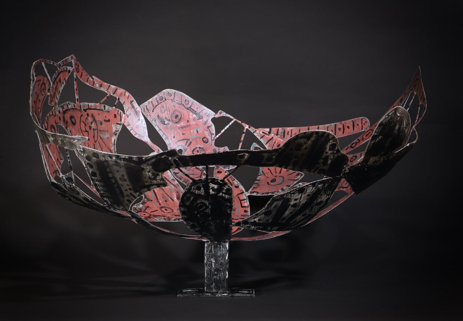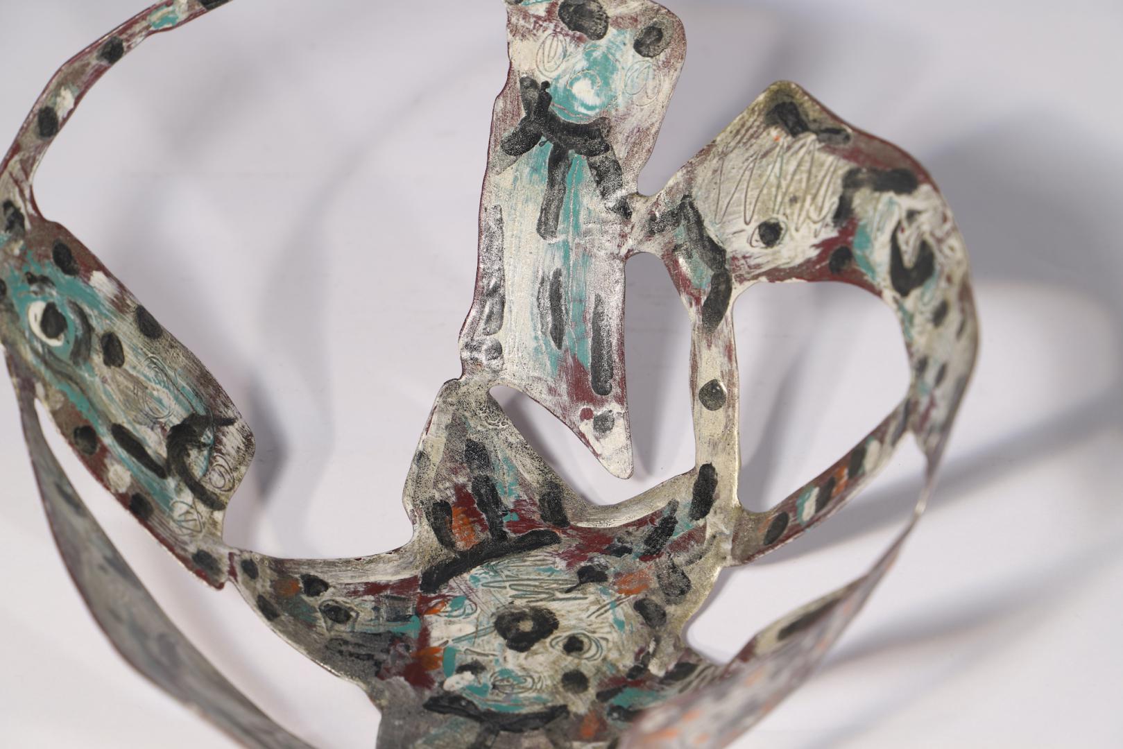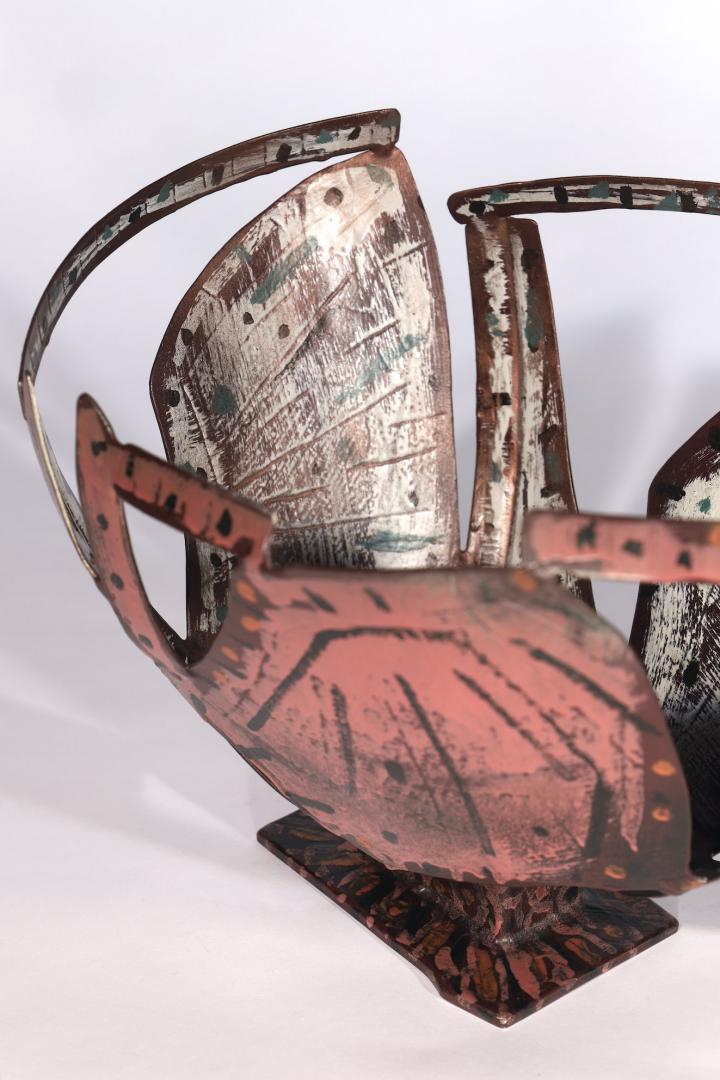 Mais avant d’être un plateau ou un vase, ces pièces sont d’abord et surtout des sculptures et leur réalisation a été guidée par mes exigences de sculpteur, à savoir une œuvre rythmée, qui se définit et qui à sa propre fonction dans l’espace. La peinture est venue jouer un rôle primordial en exaltant les formes de ces sculptures, les faisant vibrer d’avantage, leur donnant un aspect graphique et libre. Et comme je l’explique souvent à propos de mes sculptures peintes, j'essaie à travers une peinture quasi tribale "d'exploser" ces creux et ces pleins dans un tourbillon agité mais bien proportionné et guidé par un certain rythme voulu et essentiel à mon œuvre."