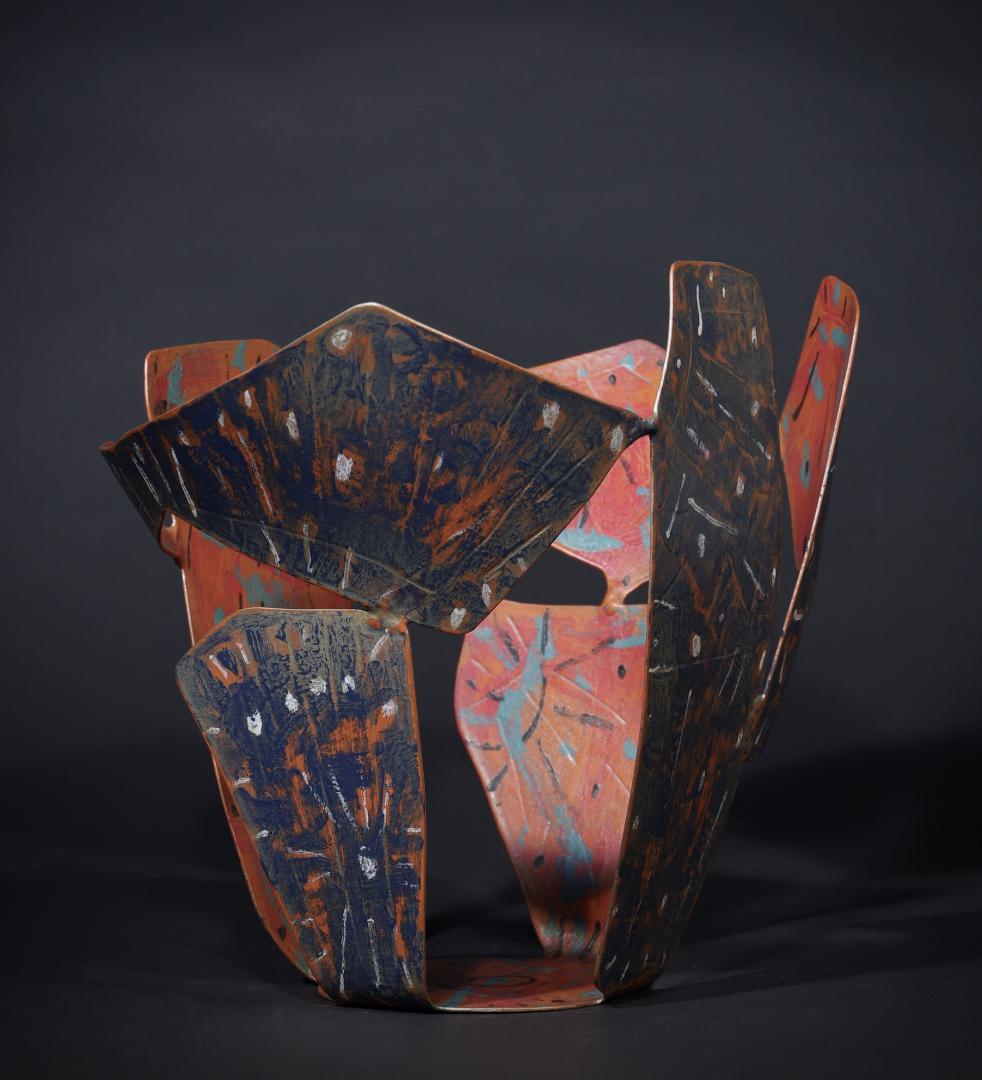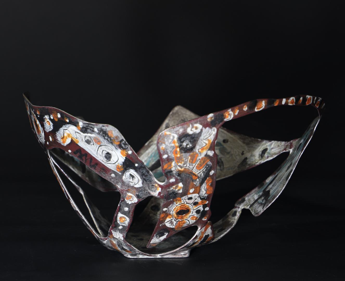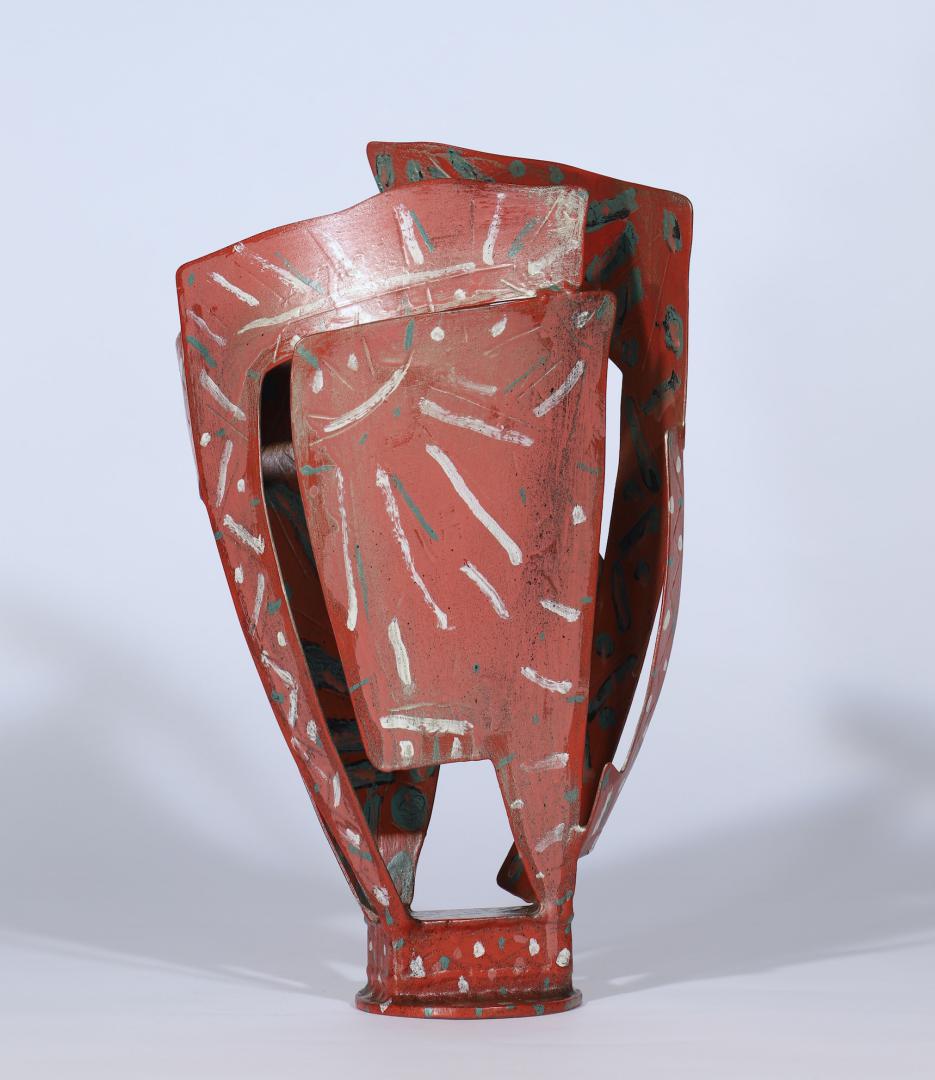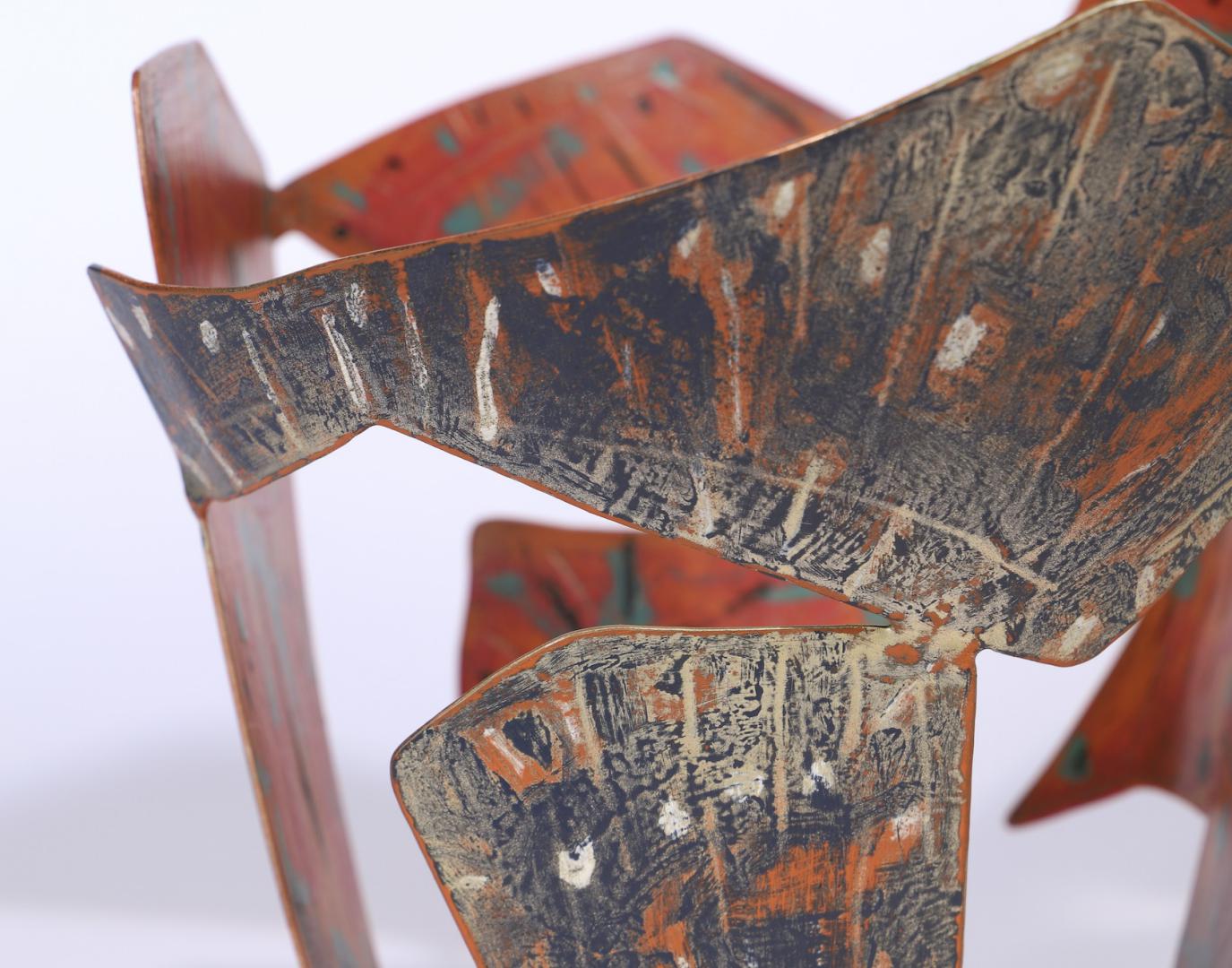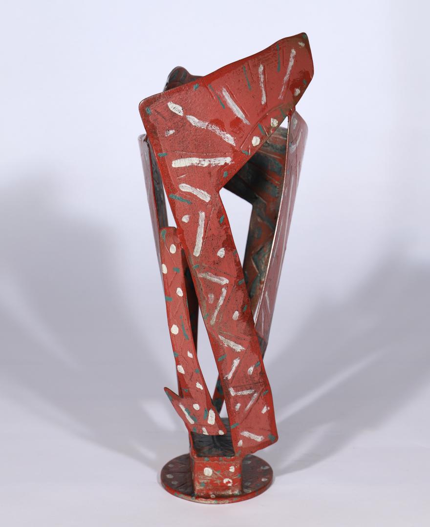 Mais avant d’être un plateau ou un vase, ces pièces sont d’abord et surtout des sculptures et leur réalisation a été guidée par mes exigences de sculpteur, à savoir une œuvre rythmée, qui se définit et qui à sa propre fonction dans l’espace. La peinture est venue jouer un rôle primordial en exaltant les formes de ces sculptures, les faisant vibrer d’avantage, leur donnant un aspect graphique et libre. Et comme je l’explique souvent à propos de mes sculptures peintes, j'essaie à travers une peinture quasi tribale "d'exploser" ces creux et ces pleins dans un tourbillon agité mais bien proportionné et guidé par un certain rythme voulu et essentiel à mon œuvre."