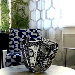 "Cette série se trouve à mi-chemin entre l’objet du quotidien et l’œuvre d’art. Le rythme trépidant des couleurs fait vibrer la pièce et exploser sa forme.